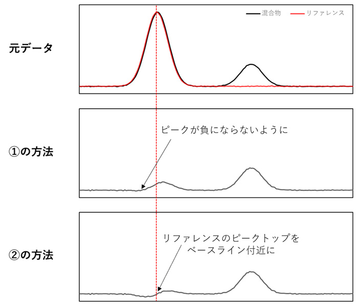 ② リファレンススペクトルのピークトップがベースライン付近に来るようにファクタを決定する