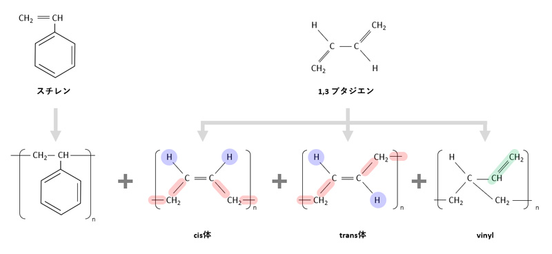 SBR は、スチレンと1,3-ブタジエンの共重合体であるポリスチレンブタジエンを架橋反応でゴム化したものです。前回のブタジエンゴムでも触れた通り、1,3-ブタジエンは 3 つのポリブタジエン構造を有します。ブタジエンゴムは cis 体が使用されることが多いですが、スチレンブタジエンゴムとして使用される場合は cis 体、trans 体、vinyl がそれぞれ適切なバランスで配合されます。以下に、SBR の分子構造を示します。