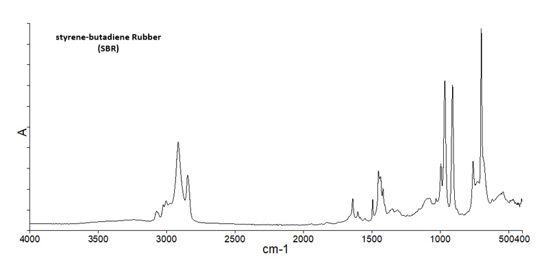 - 未配合 SBR はスチレン由来の一置換ベンゼン環のバンドと、cis 体・trans 体・vinyl それぞれに由来する C=C-H の振動バンドがあり、特に 3070、910、695 cm-1 の三本の吸収が特徴的で、これに加えてアクリロニトリルの吸収がなければ SBR と判断できます。