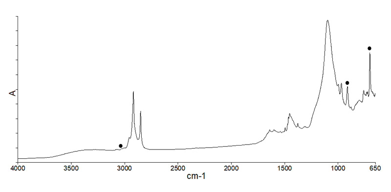まずカーボンブラック添加の影響で、スペクトルのベースラインが右肩上がりとなっています。●で示したピークが SBR に起因するものです。910、700 cm-1 に、それぞれポリブタジエン(vinyl) 特有の C=C-H 変角と、1 置換ベンゼンの C-H 面外変角が検出されていることから、SBR が存在しているとわかります。SBR の標準物質と大きく異なる点は 1100 cm-1 に太くて強い吸収が認められる点です。このピークはタイヤの充填剤として使用されるシリカに由来します。