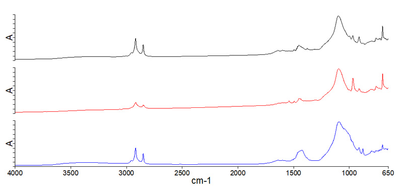 図4 自動車タイヤA(黒), B(赤), C(青) の ATR スペクトル (Ge クリスタル使用)