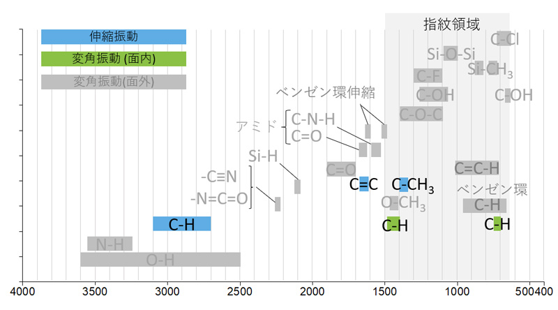 EPDM は、主にメチレン基とメチル基に由来するバンドの吸収が得られます。未配合 EPDM の主要なグループ振動を図1にまとめました。