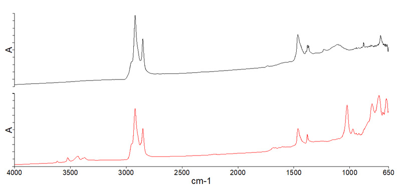 図4 O-リング(黒), 発泡スポンジ(赤)の ATR スペクトル (Ge クリスタル使用)