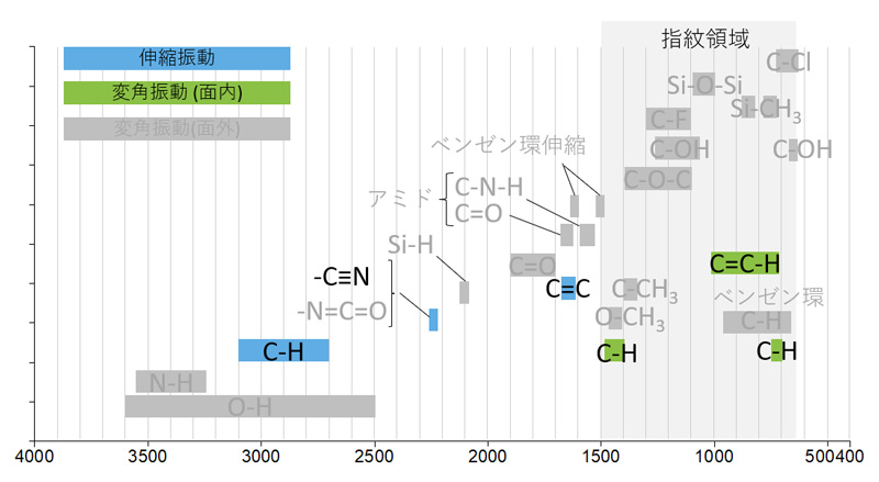 NBR は、C-H バンド、ニトリル(-C≡N)バンド、C=C-H 二重結合に由来するバンドの吸収が得られます。未配合 NBR の主要なグループ振動を図1にまとめました。
