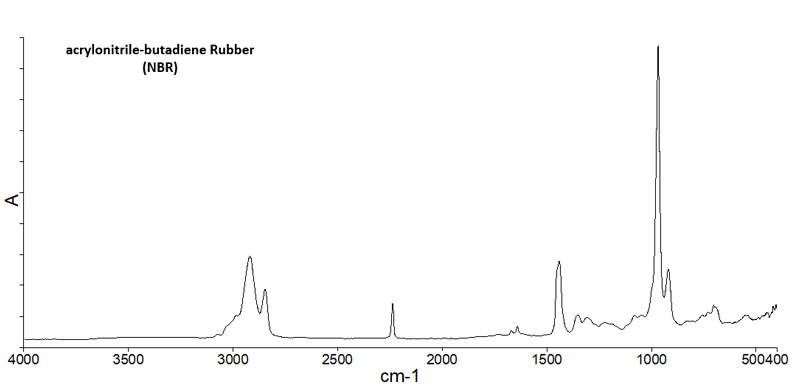 - 未配合 NBR はニトリル基由来の 2240 cm-1 のバンドと、trans 体ビニレン基に由来する 965 cm-1 の C=C-H の振動バンドが特徴的です。これに加えて一置換ベンゼン環の吸収がなければ NBR と判断できます。