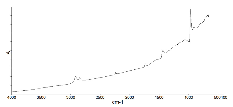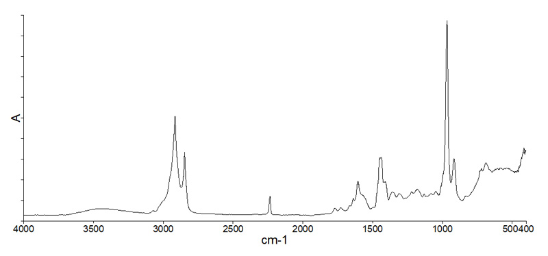 ニトリル手袋は、主に NBR を原料として作られた使い捨て手袋です。医療現場、研究室、食品工場、製造業、清掃作業など、幅広い分野で使用されています。ニトリル手袋は、天然ゴム(ラテックス)手袋や塩化ビニル(PVC)手袋と並ぶ代表的な使い捨て手袋の一つであり、耐油性・耐薬品性・機械的強度に優れる点が大きな特徴です。ニトリル手袋の IR スペクトルを示します。