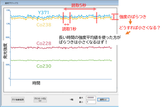 (発光強度を連続シグナル表示すると、発光強度が上下動している様子が見て取れます。)