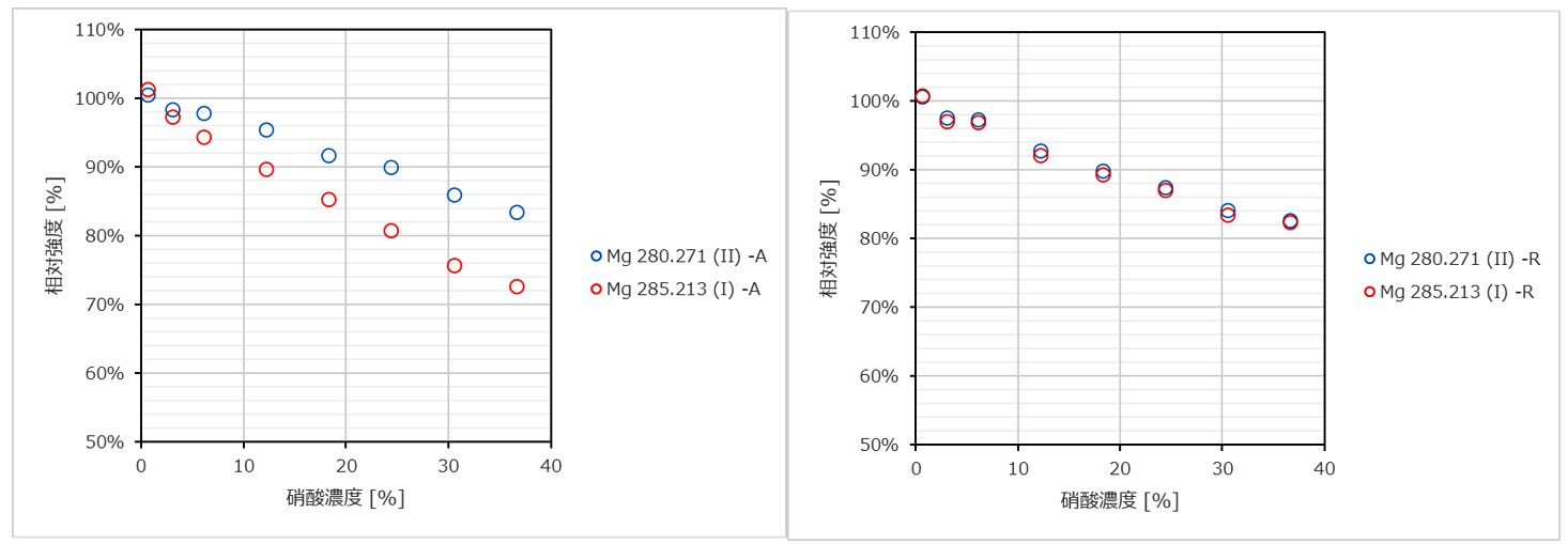 硝酸濃度の影響による 〇 Mg 280.271 (II) と 〇 Mg 285.213 (I) の強度比の変化