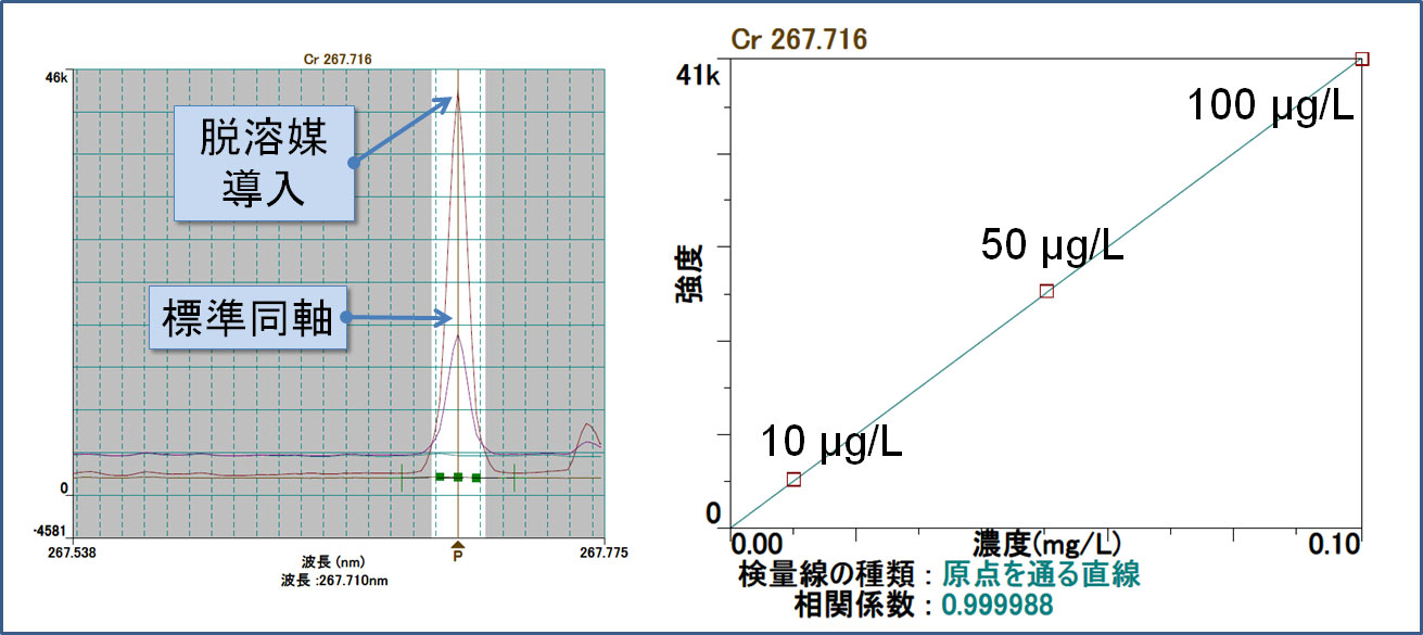超音波ネブライザーは、同軸ネブライザーとは異なり、溶液を振動子に連続的に接触させ、霧を発生させることを利用します。その後、微細な霧となったサンプルをキャリヤーガスで移動させながら加熱(120~140 ℃前後)と冷却(3~5 ℃前後)を行い、脱溶媒を行う高感度導入システムです。一般的に3 倍から10 倍の感度向上が見込めます。下記に発光スペクトルの強度比較を載せます。超音波ネブライザーと同様な機構でありながら、同軸ネブライザーを利用できるAPEX(えーぺっくす)という高感度化の試料導入装置もあります。これもとても有効なツールだと思います。