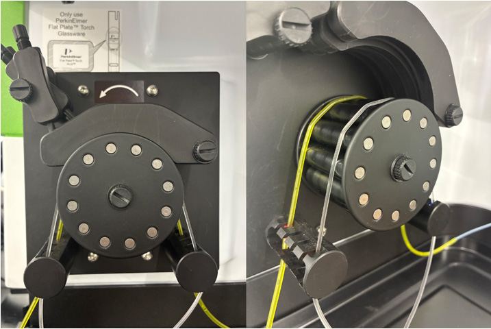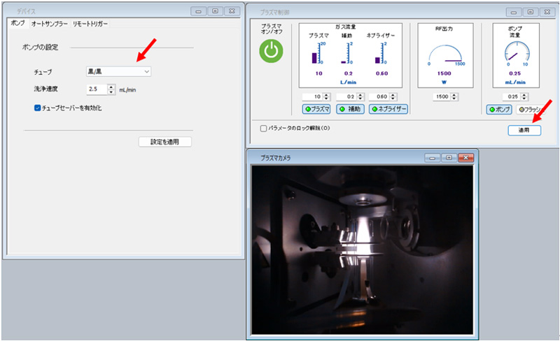 ちなみに、パーキンエルマーICP-OES はポンプチューブの種類をデバイス設定し、ポンプ流量設定値欄に指定の任意流量(今回は0.25 mL/min)を入力することで流量設定ができます。ポンプの種類を指定することで、そのチューブでその流速になるように自動的にペリスタルティックポンプの回転数を調整してくれます。つまり、太いポンプチューブだとペリスタルティックポンプの回転数は遅くなり、細いポンプチューブだと回転数は速くなります。