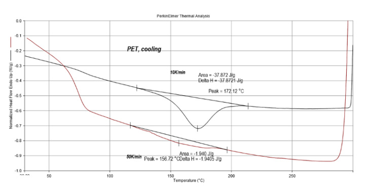 (図) 冷却過程のDSC結果で10 ℃/minの冷却(黒)と50 ℃/minの冷却(赤)です。160~170 ℃位に発熱ピークがあります。